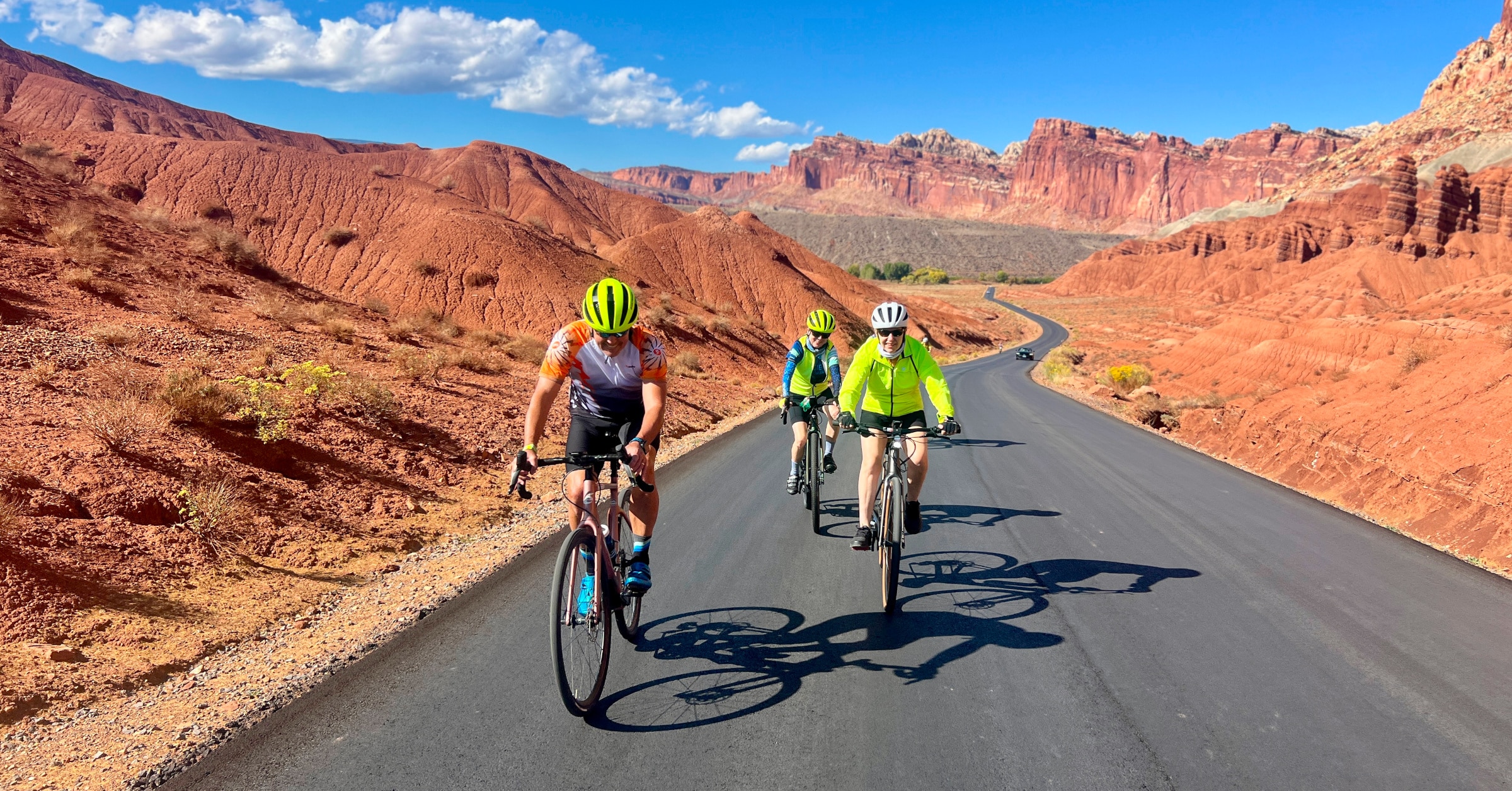 The Burr Trail is one of those roads that feels like it was designed specifically for bikes. Smooth pavement, almost no traffic, and a route that takes you from high desert down into a dramatic canyon, and Capitol Reef is the backdrop as we pedal East. The scenery changes constantly, and the road just keeps flowing.